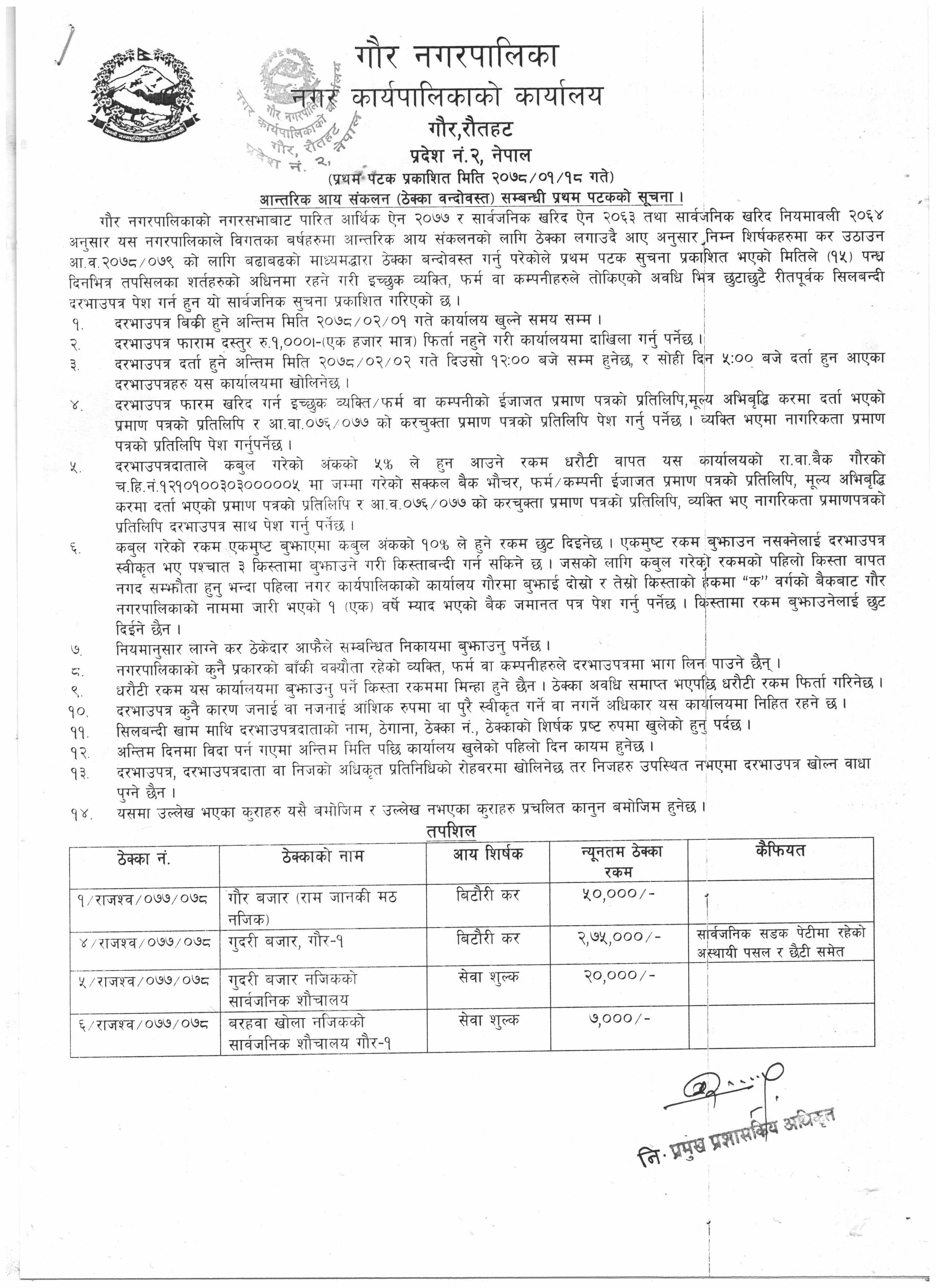 आन्तरिक आय ठेक्का बन्दोवस्त सम्बन्धी सूचना ।