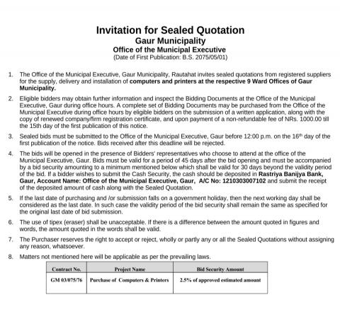 » गौर नगरपालिकाको लागि कम्प्यूटर र प्रिंटर सार्वजनिक खरीद को सूचना